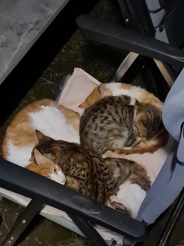 Gegen Abend packen wir dann so langsam unseren Kram, denn morgen soll es wieder auf Tour gehen. Eine letzte Nacht darf unsere Gastkatzenfamilie unseren Campingstuhl noch in Beschlag nehmen.