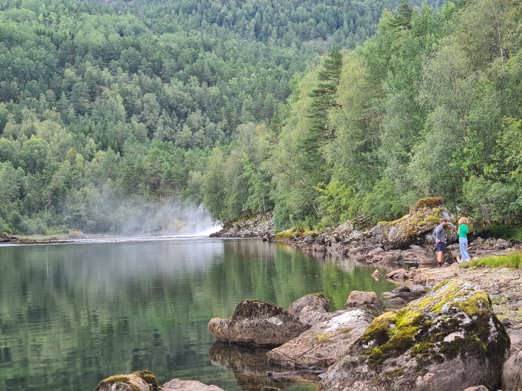 Bis auf einen Angler begegnen wir keiner Menschenseele, was uns die Wildheit und weitgehende Unberührtheit dieser Landschaft noch intensiver erscheinen lässt. Der Angler zieht binnen kürzester Zeit Forellen aus dem Wasser, die der Angel unterhalb des Wasserfalles förmlich schon entgegenzuspringen scheinen. Und natürlich klingelt morgen ganz früh der Wecker, weil Lars dann auch sein Glück versuchen will.
