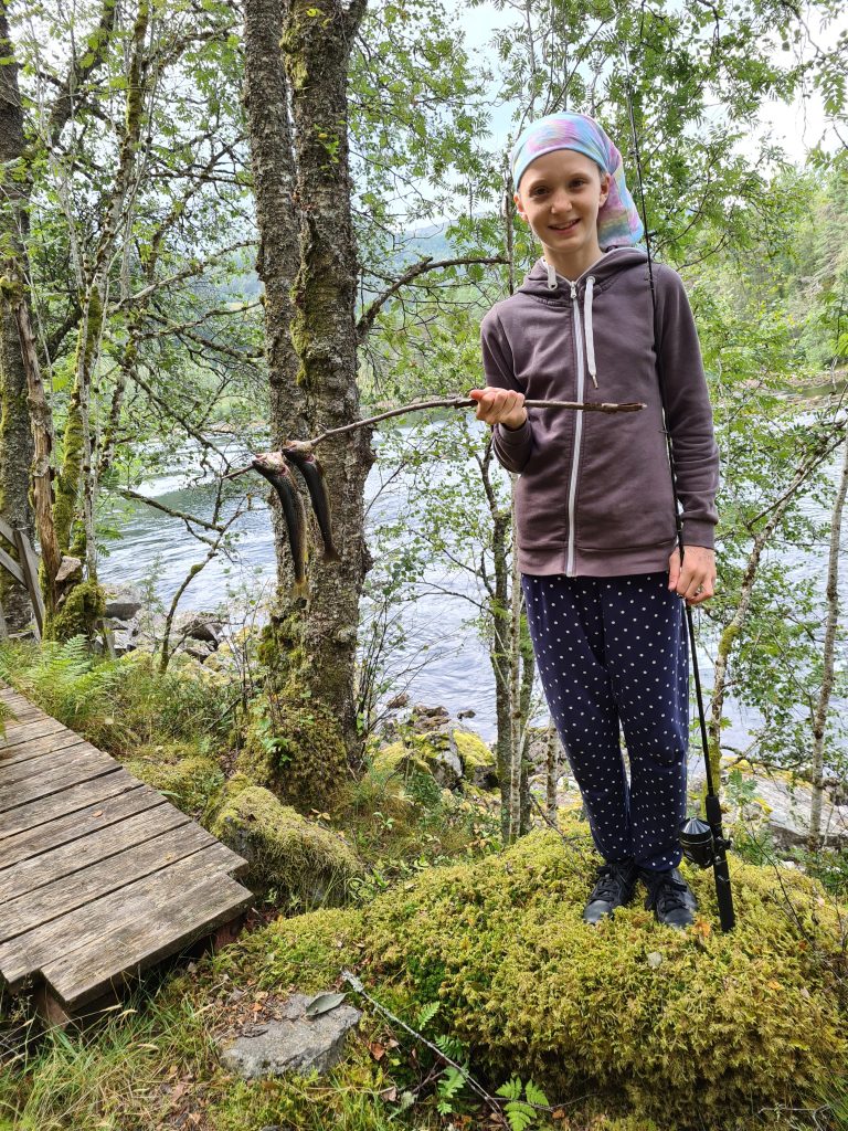 Am nächsten Tag vor der Weiterfahrt fängt Klara zwei Bachforellen.