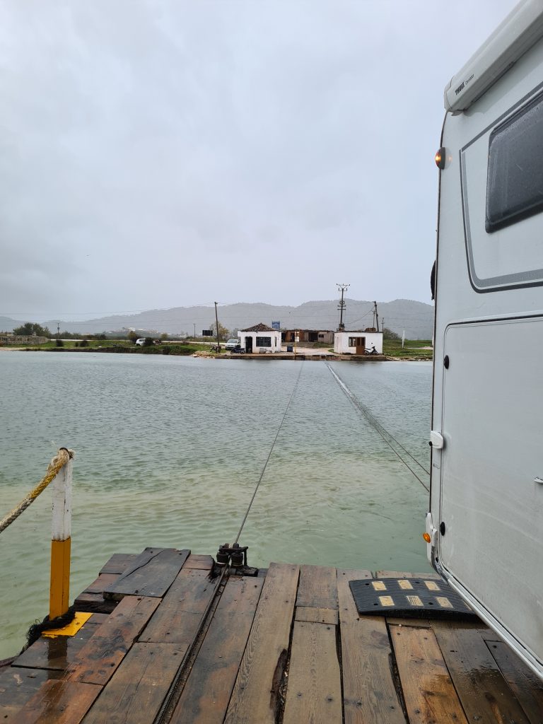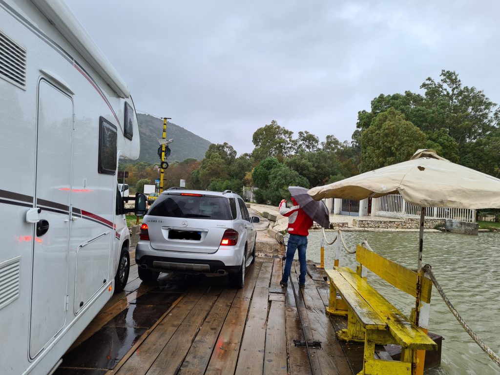 Es regnete seit nunmehr 36 Stunden. Glücklicherweise mussten wir auf den schmalen Straßen auf dem Weg zum Seilfloß in Butrint, welches übrigens im Routenplaner nicht einmal angezeigt wurde, nur einigen Orangenbauern ausweichen. Als wir am Wasser ankamen, war es schon mit einem Mercedes Kombi belegt. Ich schaltete den Motor ab und wollte mich gerade entspannt zurücklehnen, als mir bedeutet wurde, ich solle mein Fahrzeug ebenfalls noch auf das Holzgestell lenken. Das musste ein Fehler sein!