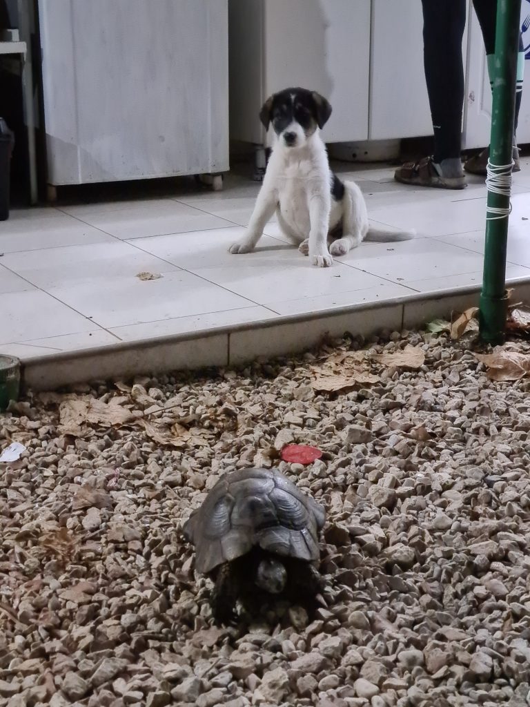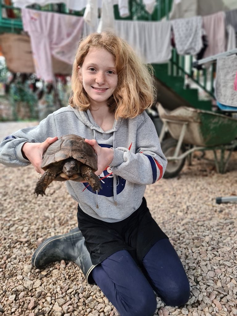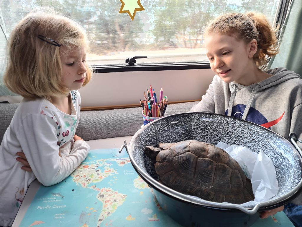 Die Landschildkröte auf dem Campingplatz, ein wohl gut gemeintes Geschenk eines Gastes, soll wieder in die Wildnis zurück. So darf sie ein Stück mit uns mitfahren und wir halten in den Bergen, um sie dort wieder auszuwildern.