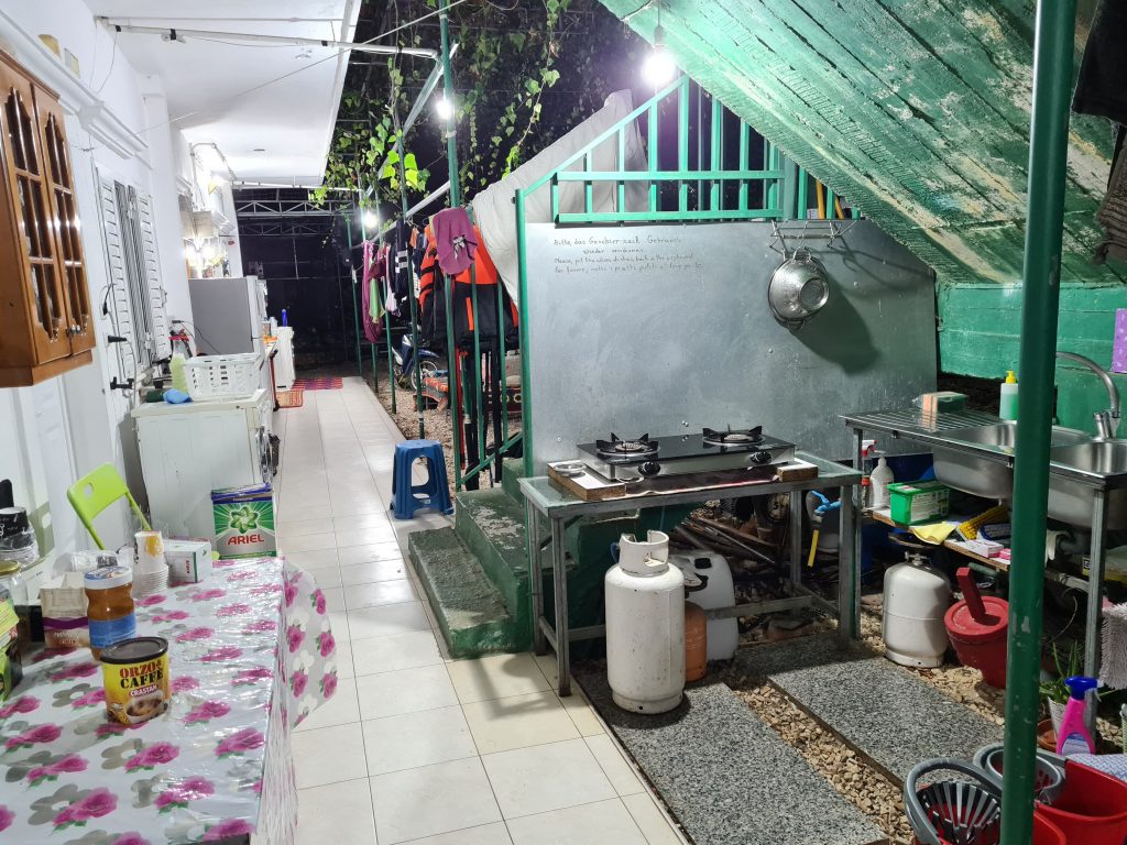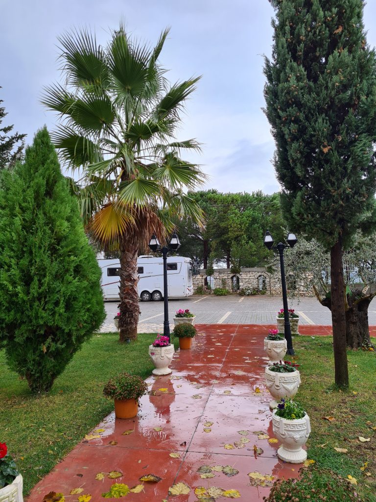 Nach einer spektakulären Überfahrt auf die Halbinsel Ksamil, bei der wir zwischenzeitlich die Befürchtung hatten, dass das wankende Fährfloß unser liebgewonnenes Wohnmobil jeden Moment dem Ionischen Meer übergeben könnte, sind wir ziemlich froh, unseren Campingplatz zu erreichen. Dort erwarten uns schon die Besitzer, ein sehr nettes albanisches Lehrerpaar, die sich mit dem kleinen Campingplatz auf ihrem Privatgrundstück etwas dazuverdienen.