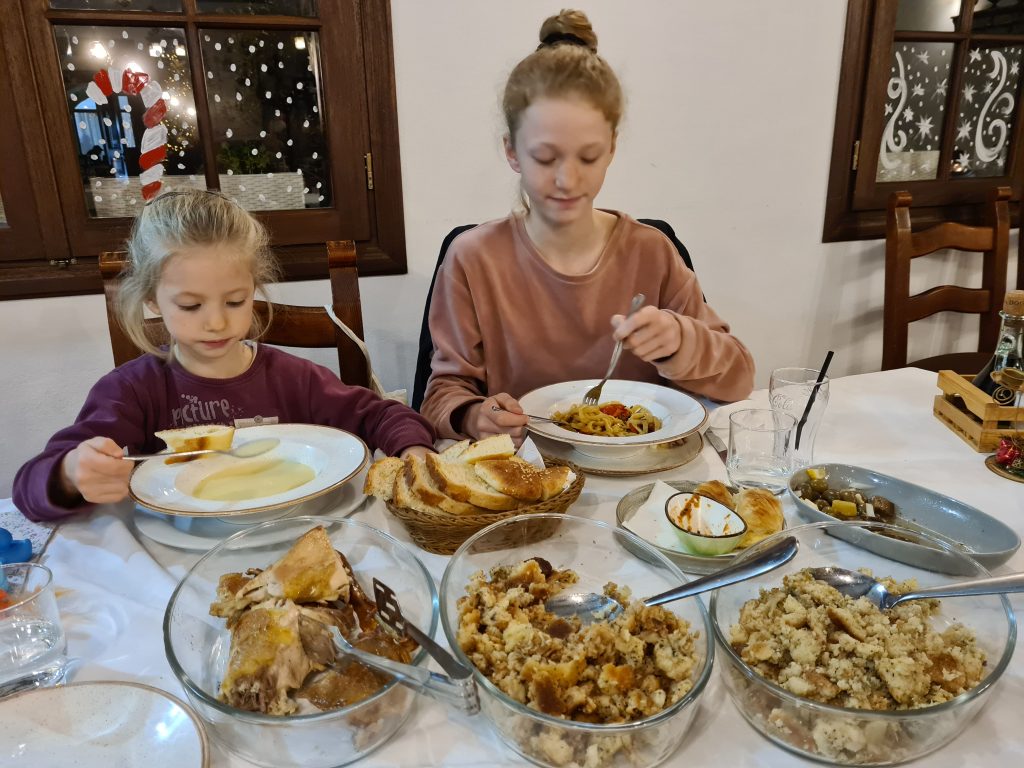 Umso positiver sind wir überrascht, als wir an unserer nächsten Station ankommen. Ein Restaurant, wo man als Camper umsonst über Nacht stehen darf und auch noch gratis Strom, WLAN und Duschmöglichkeiten hat. Wir staunen über die große, sehr moderne und gepflegte Anlage, die so sehr in Kontrast zu den vielen Schmuddelecken steht, die wir heute durch den Regenschleier erahnen konnten. Der Empfang ist ausgesprochen herzlich und wir genießen ein wunderbares traditionell albanisches Abendessen zu einem unglaublich kleinen Preis. Im Raum nebenan feiert eine albanische Familie den ersten Geburtstag des Sohnemannes in einer Größenordnung, die wir kaum glauben können. Wir schauen eine Weile dem regen Treiben mit traditioneller Musik und Kreistänzen zu und stellen uns vor, wie es wohl wäre, wenn bei uns zuhause an einem Geburtstag alle zusammen um den Tisch tanzen würden. Klara und Jule sind jedenfalls dafür, dass wir das demnächst unbedingt mal ausprobieren sollten!